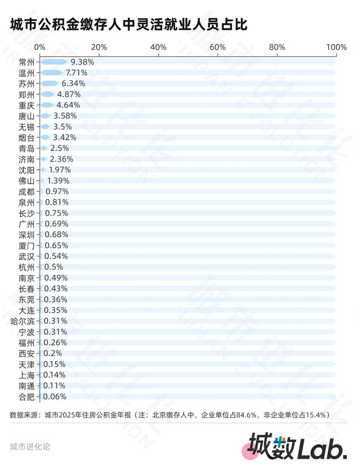 公积金缴存覆盖面(实缴人数占常住人口比重)方面,北京最高(42.7%),其次为深圳(40.5%)、上海(37.2%)、苏州(36.3%)、杭州(31.9%);泉州最低(7.3%)。泉州如此特殊,与当地民营经济高度分散化特征有关——对政策导向的公积金制度落实和接受程度相对滞后,表现在缴存规模与覆盖面上也相对靠后。