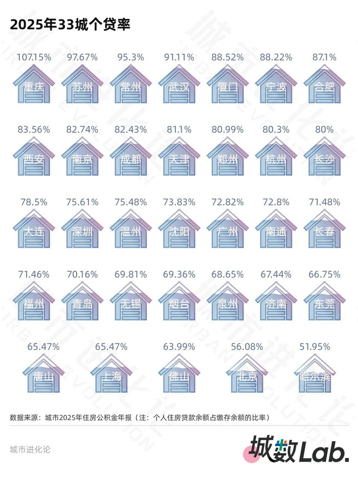 提取率(提取额/缴存额)方面,深圳高达91.06%,资金流动性极强;烟台仅63.11%。值得注意的是,33城中23座城市提取率较上年下降,哈尔滨下降超20个百分点。